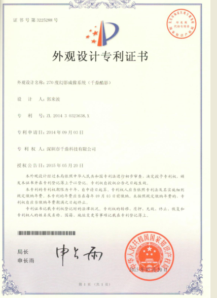 千鼎公司270幻影成像获得了外观设计专利,该产品是千鼎公司自开模具,带互动感应的全息影像产品,并且攻克了图像自作成本高、速度慢等长期困扰市场发展的问题,同时配套销售图像拍摄和三维成型软件系统,已全部量产。目前已成为国内几家珠宝商专卖店首先展示设备。